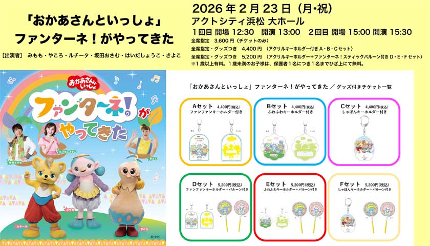 | こどもたちに大人気のキャラクターと、お兄さんお姉さんが繰り広げる歌やダンスなど、 ステージと会場が一体となって盛り上がる『わくわくステージ』です。 2026年2月23日(月・祝) 1回目 13:00開演/2回目 15:30開演(開場は各30分前) アクトシティ浜松 大ホール [出演者]みもも・やころ・ルチータ・坂田おさむ・はいだしょうこ・きよこ 出演者変更のお知らせ:関沢圭司さん ⇒ きよこさん 出演者変更に伴う払い戻しは行いません。予めご了承ください。 *全席指定 3,600円(チケットのみ) *全席指定/グッズ付き 4,400円(A・B・Cセット/アクリルキーホルダー付き) *全席指定/グッズ付き 5,200円(D・E・Fセット/アクリルキーホルダー+ファンターネ!バルーン付き) 種類の詳細は必ず東京音協ホームページにてご確認ください。 ※1歳以上有料 ※1歳未満のお子様は、保護者1名につき1名までひざ上にて無料 ◇上演時間 約1時間(休憩なし) ◇車椅子でのご来場はチケット購入前にエンボス(053-412-1010)までご連絡ください ◇公演実施に関する最新情報は、東京音協ホームページで必ずご確認ください。 東京音協:https://t-onkyo.co.jp/ チケット下記にて発売中! ■アクトシティチケットセンター 店頭販売のみ/10:00~19:00 ■HCFオンラインショップ https://www.hcf.or.jp/ ■東京音協オンラインチケット http://t-onkyo-web.pia.jp/ ※PC/スマートフォン共通 (一般発売日以降座席選択可能) ■チケットぴあ https://w.pia.jp/t/okaasan/ ※PC/携帯/スマートフォン共通 セブン-イレブン(Pコード:658-400/直接購入可能) ■イープラス https://eplus.jp/okaasan/ ※PC/スマートフォン共通 ファミリーマート店内端末「マルチコピー機」(直接購入可能) ■ローソンチケット https://l-tike.com/okaasan/ ※PC/スマートフォン共通 ローソン、ミニストップ店内端末「Loppi」(Lコード:40223/直接購入可能) ■Boo-Wooチケット ※PC/スマートフォン共通 https://l-tike.com/bw-ticket/play/funtane/ ■アソビュー! https://onkyo.my.urakata.app/channels/a4f6a700-3e09-435e-b0d2-f6dd3ed54118/products?salesProductTagCode=bo8r6oftje ※PC/携帯/スマートフォン共通 ■エンボス電話予約 053-412-1010 ★★★グッズ付きチケットについて★★★ 種類の詳細は必ず東京音協ホームページにてご確認ください。 グッズ付きAセット、Bセット、Cセットのグッズは「アクリルキーホルダー」になります。 グッズ付きDセット、Eセット、Fセットのグッズは「アクリルキーホルダー」と「ファンターネ!バルーン」になります。 「アクリルキーホルダー」は絵柄が3種類ございますのでお好きな絵柄をお選びください! AセットとDセット→ファンファンキーホルダー BセットとEセット→ふわふわキーホルダー CセットとFセット→しゃぼんキーホルダー ※グッズ付きチケットの当日券販売はございません。 ※グッズ付きチケットは、「入場券」とは別に「引換券」が発券されます。 必ずお客様ご自身で「入場券」と「引換券」があることをご確認下さい。 紛失時などの再発行はできません。 ※グッズ付きチケットのお客様には、ご観劇公演の開場時間中に会場にてグッズを引き換え致します。 ※一般チケットとグッズ付きチケットは併せてご購入いただけます。 例:グッズ付きAセット1枚+グッズ付きDセット1枚+一般チケット2枚=4枚購入 ※グッズ付きチケット1枚につき、グッズ1点のお渡しとなります。 ※公演当日、会場では「ファンターネ!バルーン」など会場でしか手に入らないオリジナルグッズの販売を予定しております。 販売商品のラインナップは改めて東京音協ホームページでご案内させていただきます。 なお、「アクリルキーホルダー」はグッズ付きチケットの限定商品となりますので、会場ではご購入いただけません。 |