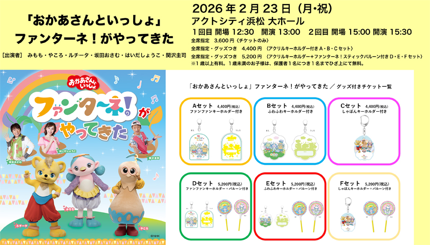 | こどもたちに大人気のキャラクターと、お兄さんお姉さんが繰り広げる歌やダンスなど、 ステージと会場が一体となって盛り上がる『わくわくステージ』です。 2026年2月23日(月・祝) 1回目 13:00開演/2回目 15:30開演(開場は各30分前) アクトシティ浜松 大ホール [出演者]みもも・やころ・ルチータ・坂田おさむ・はいだしょうこ・関沢圭司 *全席指定 3,600円(チケットのみ) *全席指定/グッズ付き 4,400円(A・B・Cセット/アクリルキーホルダー付き) *全席指定/グッズ付き 5,200円(D・E・Fセット/アクリルキーホルダー+ファンターネ!バルーン付き) 種類の詳細は必ず東京音協ホームページにてご確認ください。 ※1歳以上有料 ※1歳未満のお子様は、保護者1名につき1名までひざ上にて無料 ◇上演時間 約1時間(休憩なし) ◇車椅子でのご来場はチケット購入前にエンボス(053-412-1010)までご連絡ください ◇公演実施に関する最新情報は、東京音協ホームページで必ずご確認ください。 東京音協:https://t-onkyo.co.jp/ チケット一般発売日:2025年11月22日(土)10:00〜 ■東京音協オンラインチケット http://t-onkyo-web.pia.jp/ ※PC/スマートフォン共通 (一般発売日以降座席選択可能) ■チケットぴあ https://w.pia.jp/t/okaasan/ ※PC/携帯/スマートフォン共通 セブン-イレブン(Pコード:658-400/直接購入可能) ■イープラス https://eplus.jp/okaasan/ ※PC/スマートフォン共通 ファミリーマート店内端末「マルチコピー機」(直接購入可能) ■ローソンチケット https://l-tike.com/okaasan/ ※PC/スマートフォン共通 ローソン、ミニストップ店内端末「Loppi」(Lコード:40223/直接購入可能) ■Boo-Wooチケット ※PC/スマートフォン共通 https://l-tike.com/bw-ticket/play/funtane/ ■アクトシティチケットセンター 店頭販売のみ/10:00~19:00 ■HCFオンラインショップ https://www.hcf.or.jp/ ■アソビュー! https://onkyo.my.urakata.app/channels/a4f6a700-3e09-435e-b0d2-f6dd3ed54118/products?salesProductTagCode=bo8r6oftje ※PC/携帯/スマートフォン共通 ■エンボス電話予約 053-412-1010 ★★★グッズ付きチケットについて★★★ 種類の詳細は必ず東京音協ホームページにてご確認ください。 グッズ付きAセット、Bセット、Cセットのグッズは「アクリルキーホルダー」になります。 グッズ付きDセット、Eセット、Fセットのグッズは「アクリルキーホルダー」と「ファンターネ!バルーン」になります。 「アクリルキーホルダー」は絵柄が3種類ございますのでお好きな絵柄をお選びください! AセットとDセット→ファンファンキーホルダー BセットとEセット→ふわふわキーホルダー CセットとFセット→しゃぼんキーホルダー ※グッズ付きチケットの当日券販売はございません。 ※グッズ付きチケットは、「入場券」とは別に「引換券」が発券されます。 必ずお客様ご自身で「入場券」と「引換券」があることをご確認下さい。 紛失時などの再発行はできません。 ※グッズ付きチケットのお客様には、ご観劇公演の開場時間中に会場にてグッズを引き換え致します。 ※一般チケットとグッズ付きチケットは併せてご購入いただけます。 例:グッズ付きAセット1枚+グッズ付きDセット1枚+一般チケット2枚=4枚購入 ※グッズ付きチケット1枚につき、グッズ1点のお渡しとなります。 ※公演当日、会場では「ファンターネ!バルーン」など会場でしか手に入らないオリジナルグッズの販売を予定しております。 販売商品のラインナップは改めて東京音協ホームページでご案内させていただきます。 なお、「アクリルキーホルダー」はグッズ付きチケットの限定商品となりますので、会場ではご購入いただけません。 |